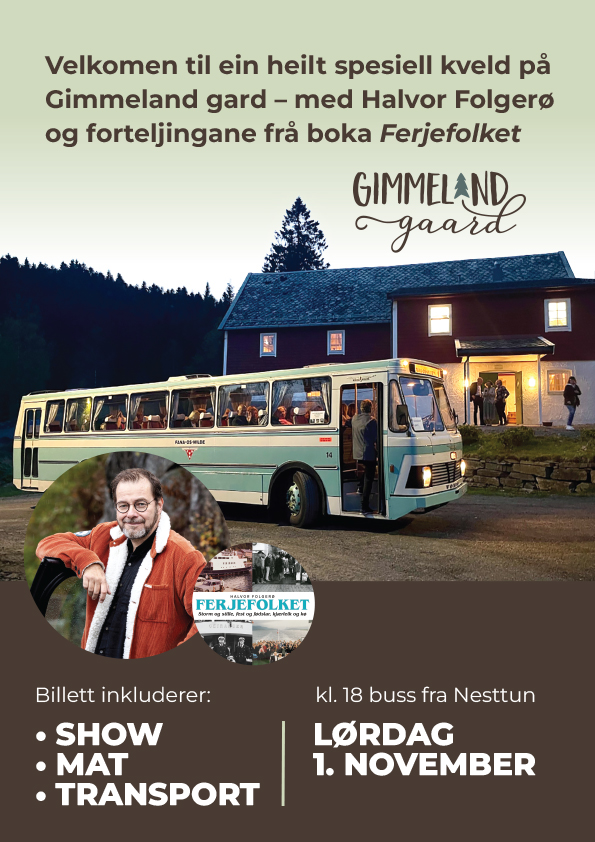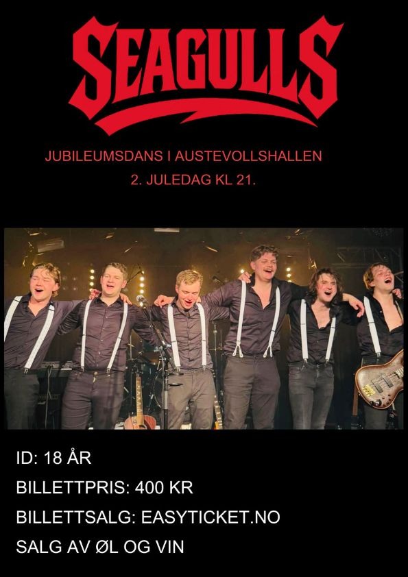 HUNDVÅKØY SAMHUNNSHUS, AUSTEVOLL GIMME! GIMME! GIMME!ABBA OG ELTON JOHN 8. NOVEMBER Finn billetter ÅSANE KULTURHUS, BERGEN BERGEN MUSIKKTEATER:SNØFALL 28-30. NOVEMBER Finn billetter KONGSEN KULTURSAL, AUSTEVOLL CHRISTMAS LIGHTSHANNE SØRVAAG 29. NOVEMBER Finn billetter FYLLINGSDALEN TEATER, BERGEN FYLLINGSDALEN TEATEREN JULEFORTELLING 20. NOVEMBER – 21. DESEMBER Finn billetter KONGSEN KULTURSAL, AUSTEVOLL BERGEN MUSIKKTEATER:SNØFALL 6. DESEMBER Finn billetter THON HOTEL, LILLESTRØM CHRISTMAS DANCE NORWAYTHON HOTEL ARENA 13. DESEMBER Finn billetter MINDEMYREN, BERGEN CIRKUS BALANCE:SNØ & CIRKUS 14. DESEMBER Finn billetter GIMMELAND GAARD, BERGEN JULEKONSERT MEDDANIEL KVAMMEN 14. DESEMBER Finn billetter AUSTEVOLL KYRKJE, AUSTEVOLL SYNG INN JULA:KORONITAS 16. DESEMBER Finn billetter AUSTEVOLLHALLEN, AUSTEVOLL SEAGULLSJUBILEUMSDANS 26. DESEMBER Finn billetter ÅSANE KULTURHUS, BERGEN LINA TOPPE:MIN EGEN KONSERT 10. JANUAR 2026 Finn billetter KONGSEN KULTURSAL, AUSTEVOLL FINN TOKVAM:VELKOMEN 24. JANUAR 2026 Finn billetter LØO, BEKKJARVIK VELKOMMEN TILSONGGALLERIET 30. – 31. JANUAR 2026 Finn billetter KONGSEN KULTURSAL, AUSTEVOLL KARI BREMNES 21. MARS 2026 Finn billetter HENGJO, BEKKJARVIK ELLE MELLEHENGJO 30. MAI 2026 Finn billetter FYLLINGSDALEN TEATER, BERGEN FYLLINGSDALEN TEATERRONJA RØVERDATTER VINTER 2026 Finn billetter FLÅ, BUSKERUD BJØRNEPARKENBILLETTER OG ÅRSKORT BILLETTER FOR 2026 KOMMER SNART Finn billetter